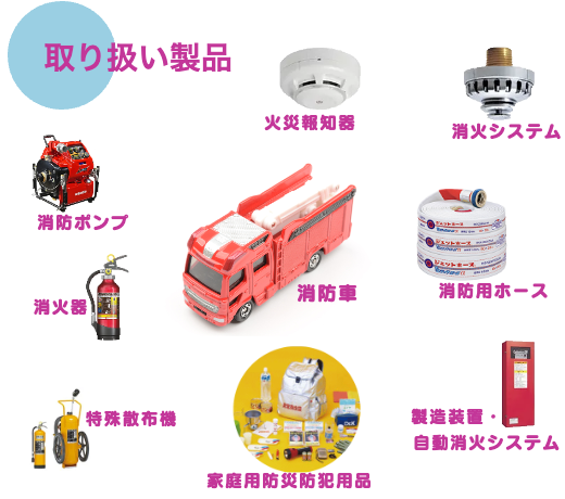 大型消防車・救助工作車・水槽車・はしご付消防車などの各種消防車や、消火栓・消火器・警報装置・家庭用防災防犯用品まで、様々な防災にかかわる商品を販売しております。